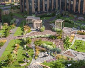 • Закрытые внутренние дворы находятся в сердце квартала под "охраной" корпусов. От этого пространство получается очень личным и уютным. Каждый двор уникален по наполнению и обустроен с мыслью о детях и взрослых. Двор первого корпуса получил название "Двор-лес". Это настоящий природный оазис, где приятно провести время с книжкой или поработать в тишине за ноутбуком