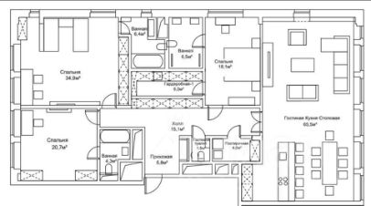— Просторная планировка: три ванные комнаты, гостевой санузел, отдельная хозяйственная и гардеробная комнаты.