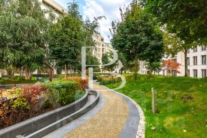 Внутренний двор - сад с красивым ландшафтным дизайном площадью 0,8 га, ландшафтная концепция была разработана британским бюро Gillespies. Сад озеленен многолетними деревьями, кустарниками, травами и цветами, лаунж-зоны, фонтан и детская площадка от немецкой компании Richter Spielgeraete.