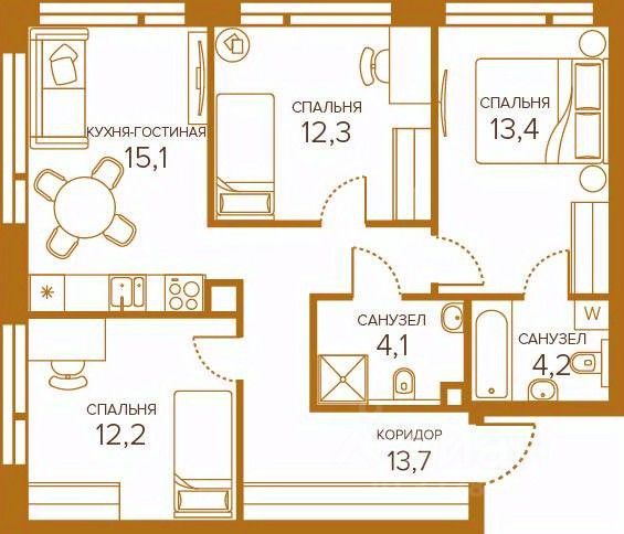 Общая площадь квартиры - 75.37 кв.м. В квартире выполнена премиальная отделка в современном стиле.