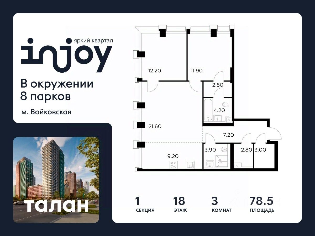 Прямая продажа от застройщика. В жилом квартале, расположенном в Войковском районе Москвы, продаётся 3-комнатная квартира площадью 78.5 кв.м без отделки. Квартира расположена на 18 этаже 35-этажного дома, корпус 1, в жилом квартале бизнес-класса INJOY.