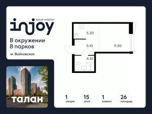 Прямая продажа от застройщика. В жилом квартале, расположенном в Войковском районе Москвы, продаётся 1-комнатная квартира площадью 26 кв.м без отделки. Квартира расположена на 15 этаже 35-этажного дома, корпус 1, в жилом квартале бизнес-класса INJOY.
