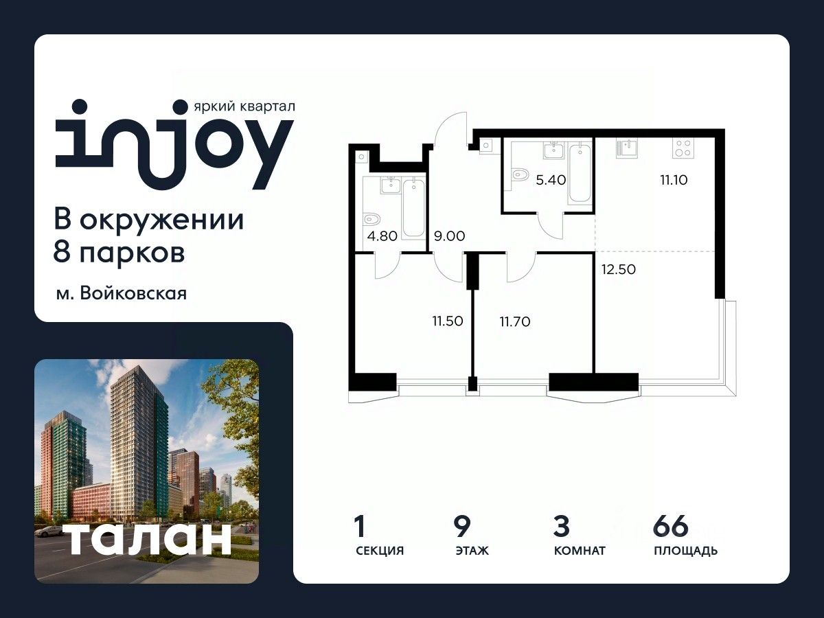 Прямая продажа от застройщика. В жилом квартале, расположенном в Войковском районе Москвы, продаётся 3-комнатная квартира площадью 66 кв.м без отделки. Квартира расположена на 9 этаже 35-этажного дома, корпус 1, в жилом квартале бизнес-класса INJOY.
