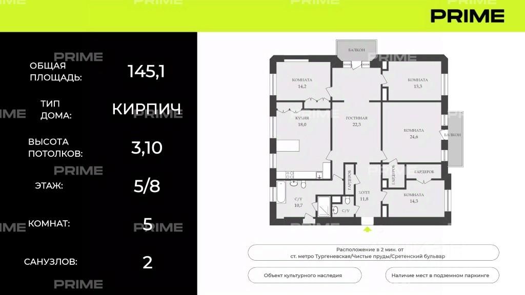 Квартира площадью 145 м² в кирпичном доме 1915 года постройки — объекте культурного наследия федерального значения. Дом с железобетонными (Ж/Б) перекрытиями и лифтом.