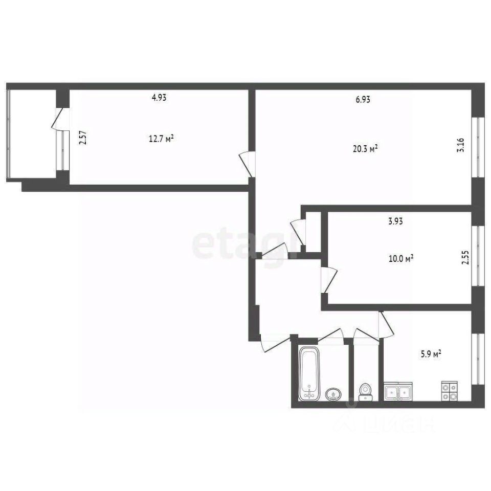 Общая площадь 58.3 кв.м, высота потолков 2.64. Две комнаты изолированные, одна смежная (10; 20,3; 12,7). Кухня 5.9 м.кв. С/у совмещённый. Состояние ремонта: заезжай и живи.