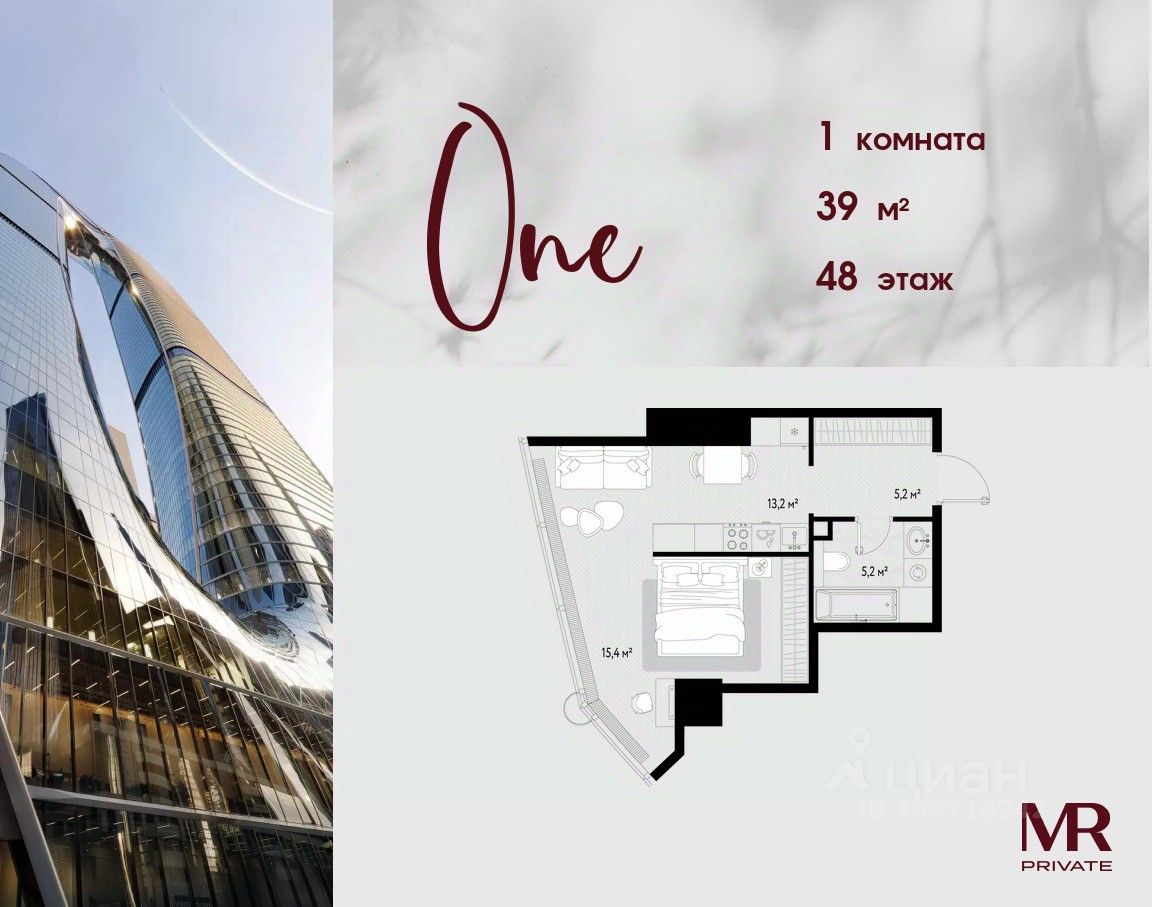 В продаже 1-комнатная квартира площадью 39.00 м² на 48-м этаже.