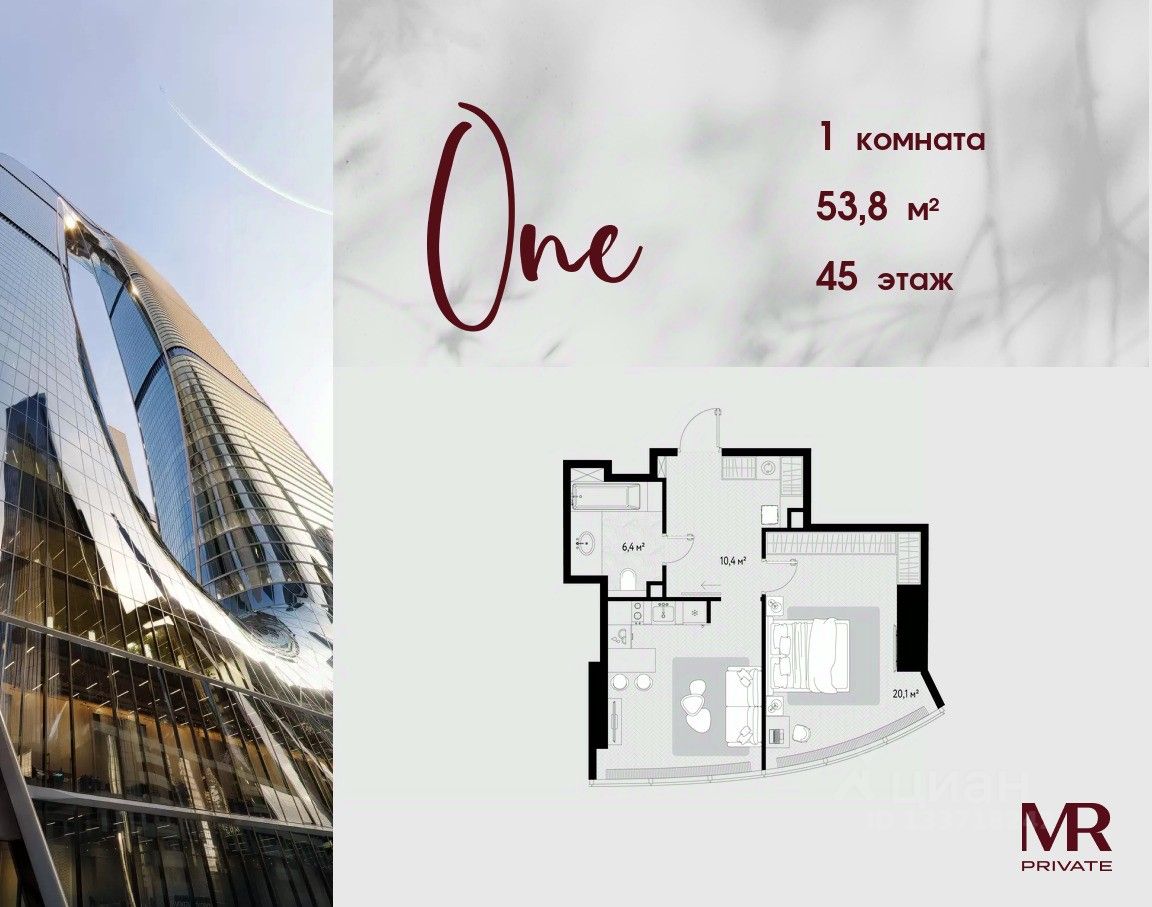 В продаже 1-комнатная квартира площадью 53.80 м² на 45-м этаже.