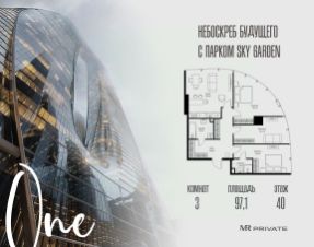 В продаже 3-комнатная квартира площадью 97.10 м² на 40-м этаже.