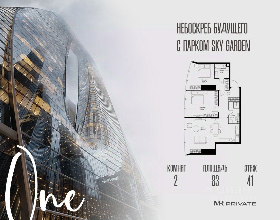 В продаже 2-комнатная квартира площадью 83.00 м² на 41-м этаже.