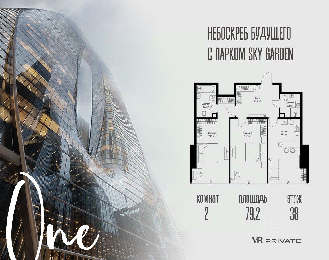В продаже 2-комнатная квартира площадью 79.20 м² на 38-м этаже.
