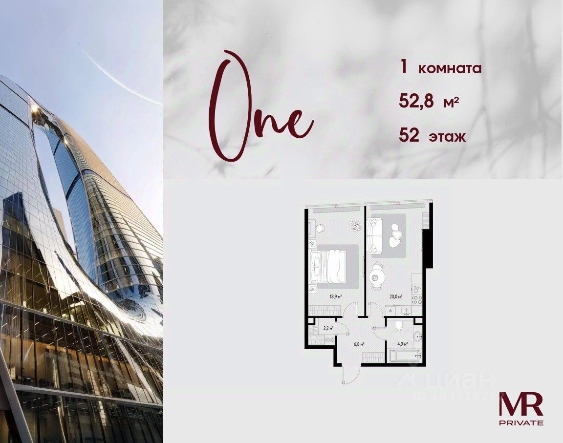В продаже 1-комнатная квартира площадью 52.80 м² на 52-м этаже.