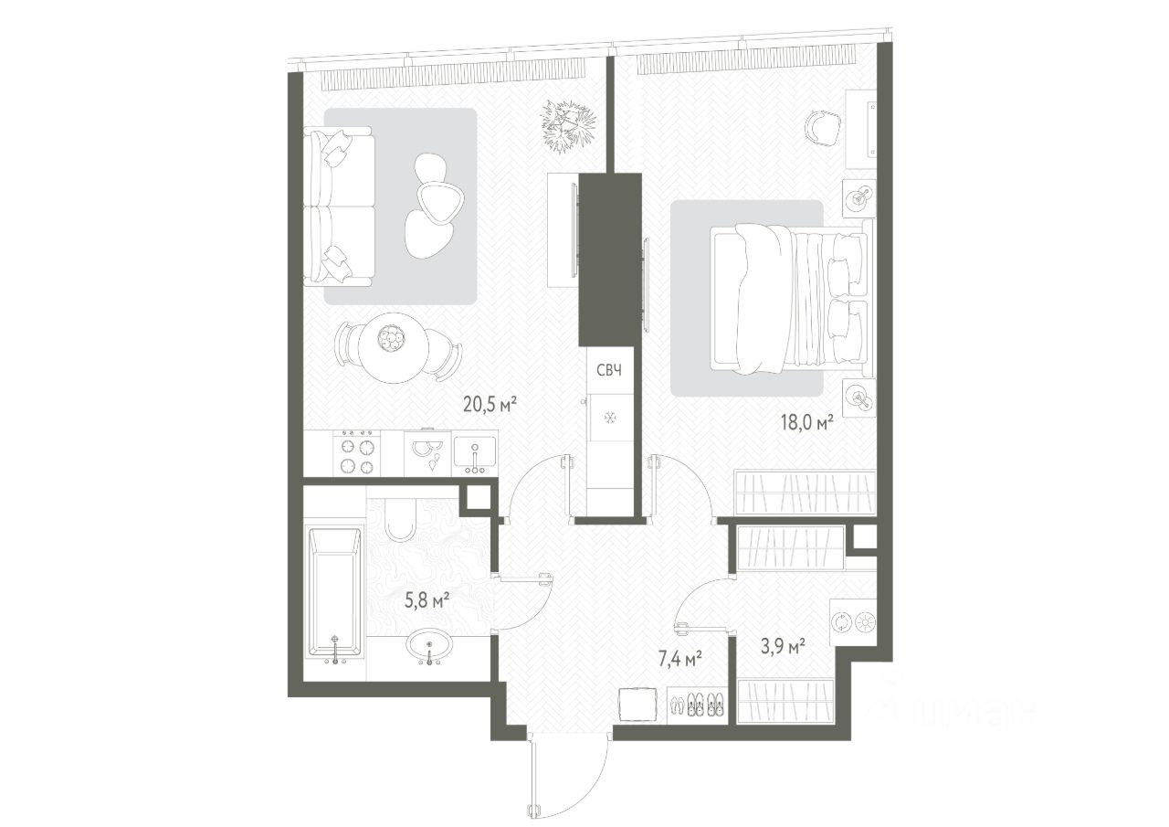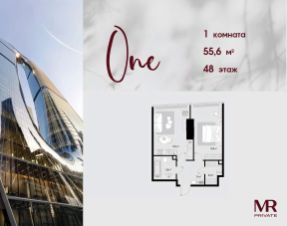 В продаже 1-комнатная квартира площадью 55.60 м² на 48-м этаже.