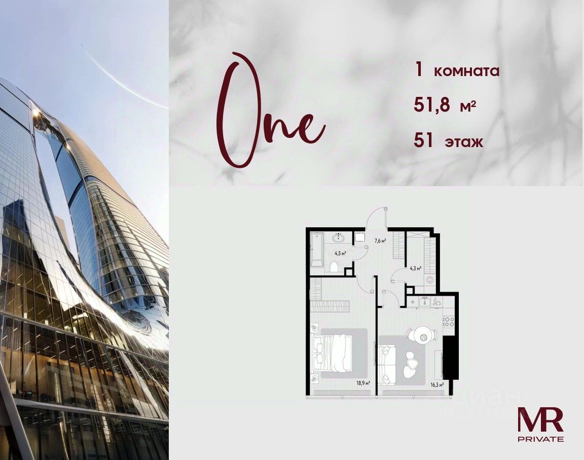 В продаже 1-комнатная квартира площадью 51.80 м² на 51-м этаже.