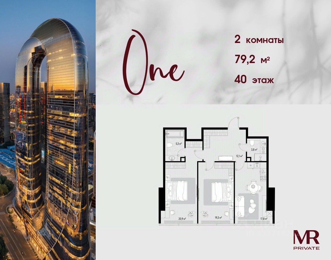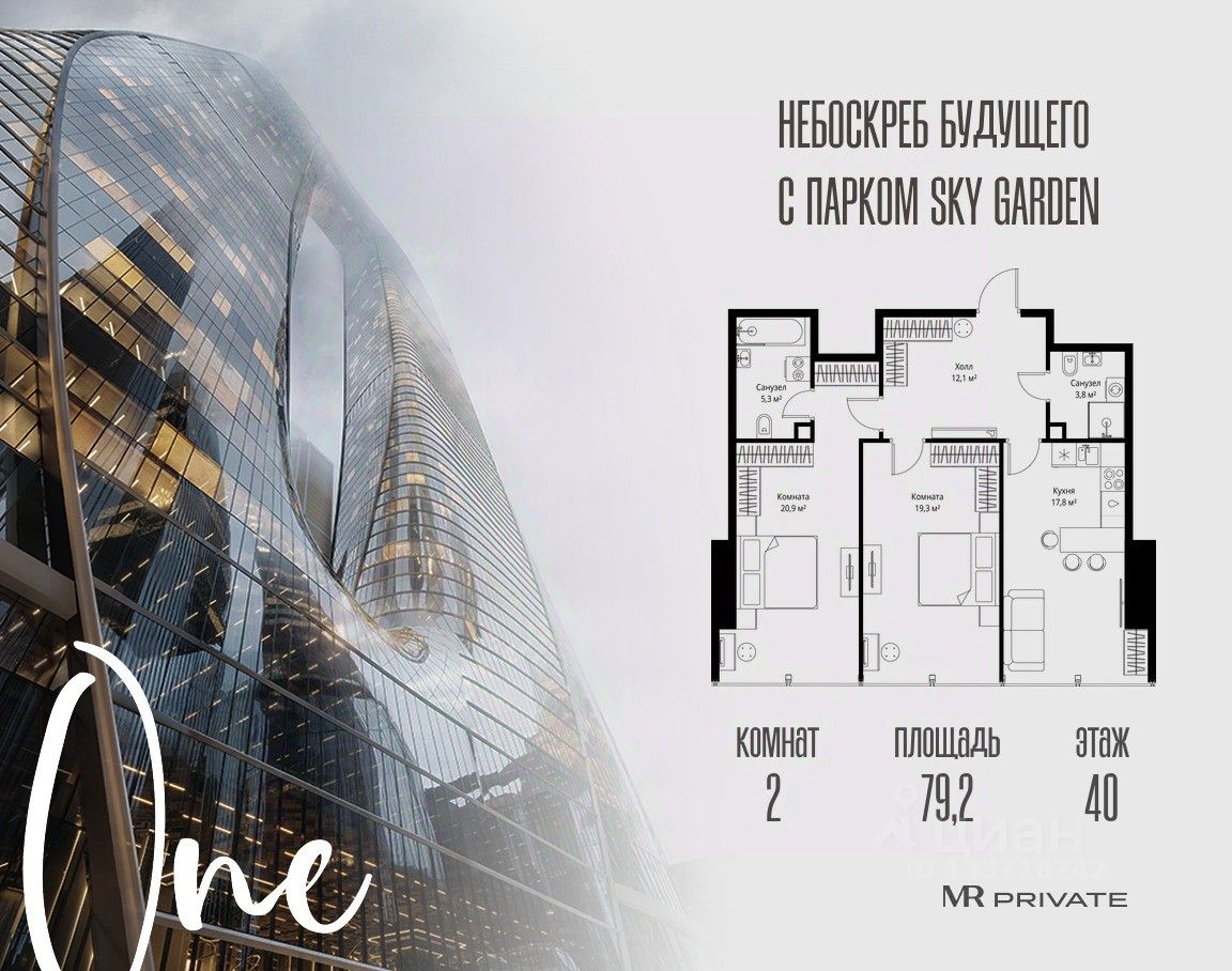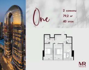 В продаже 2-комнатная квартира площадью 79.20 м² на 40-м этаже.