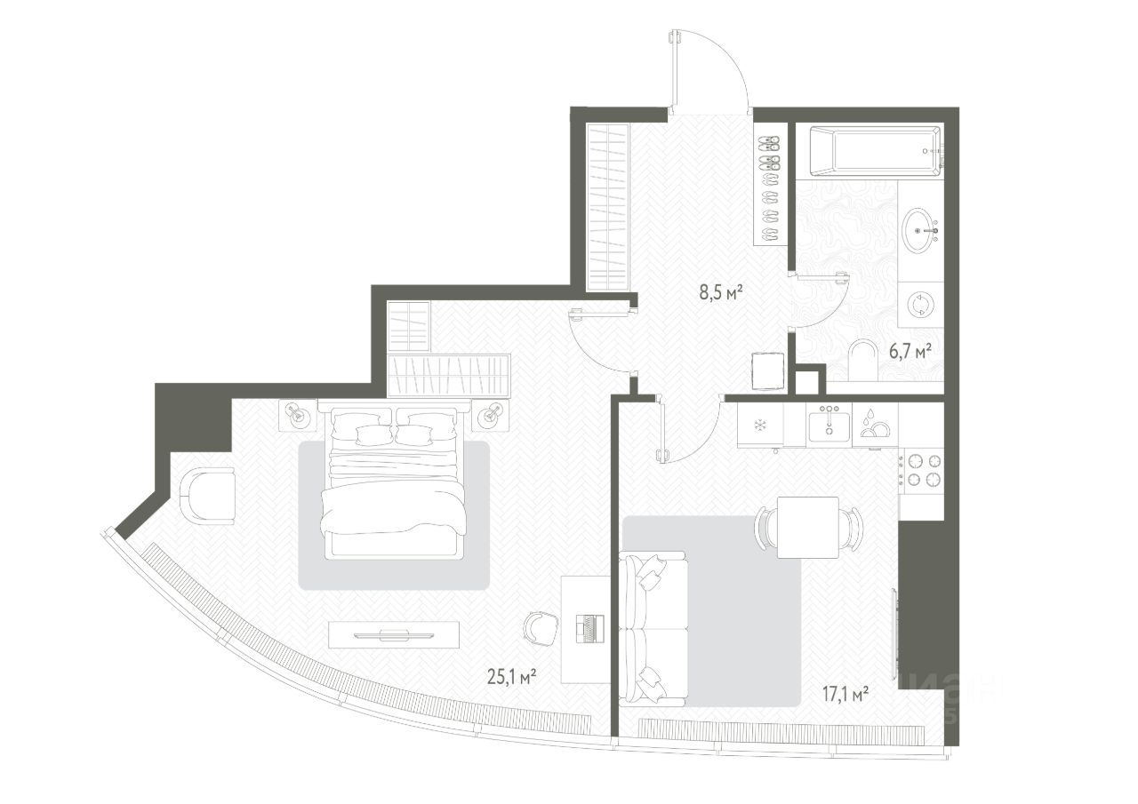 В продаже 1-комнатная квартира площадью 57.40 м² на 38-м этаже.