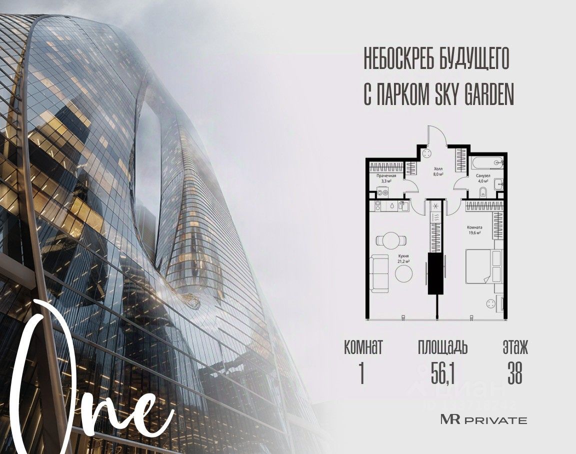 В продаже 1-комнатная квартира площадью 56.10 м² на 38-м этаже.