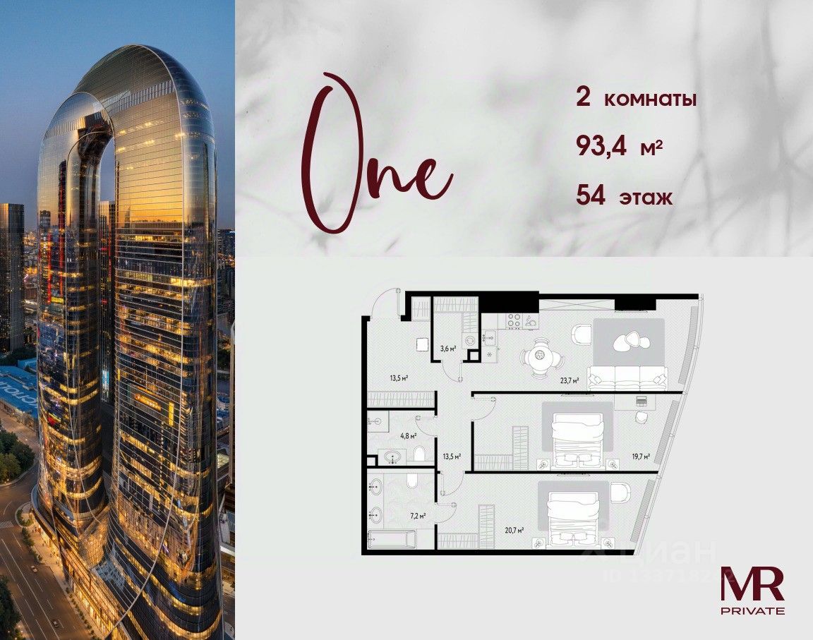 One находится в Пресненском районе, в пешей доступности от станции метро "Деловой центр". Проект был разработан выдающимся архитектором Сергеем Кузнецовым при участии международного бюро Gensler. Уникальная скульптурная форма башни, вдохновленная лентой Мебиуса, создает новый узнаваемый силуэт делового центра и задает непревзойденный стандарт вертикальной жизни. По замыслу архитекторов, жилой комплекс представляет собой две вертикальные башни, соединенные в нижней и верхней точках. На 85 этаже расположен Sky Garden — самый высокий в Европе парк с оазисом природы и секретным садом в облаках, а на 83 этаже парит стеклянный мост Sky Bridge с панорамными видами.