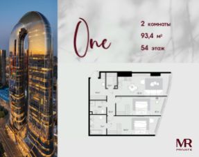 В продаже 2-комнатная квартира площадью 93.40 м² на 54-м этаже.