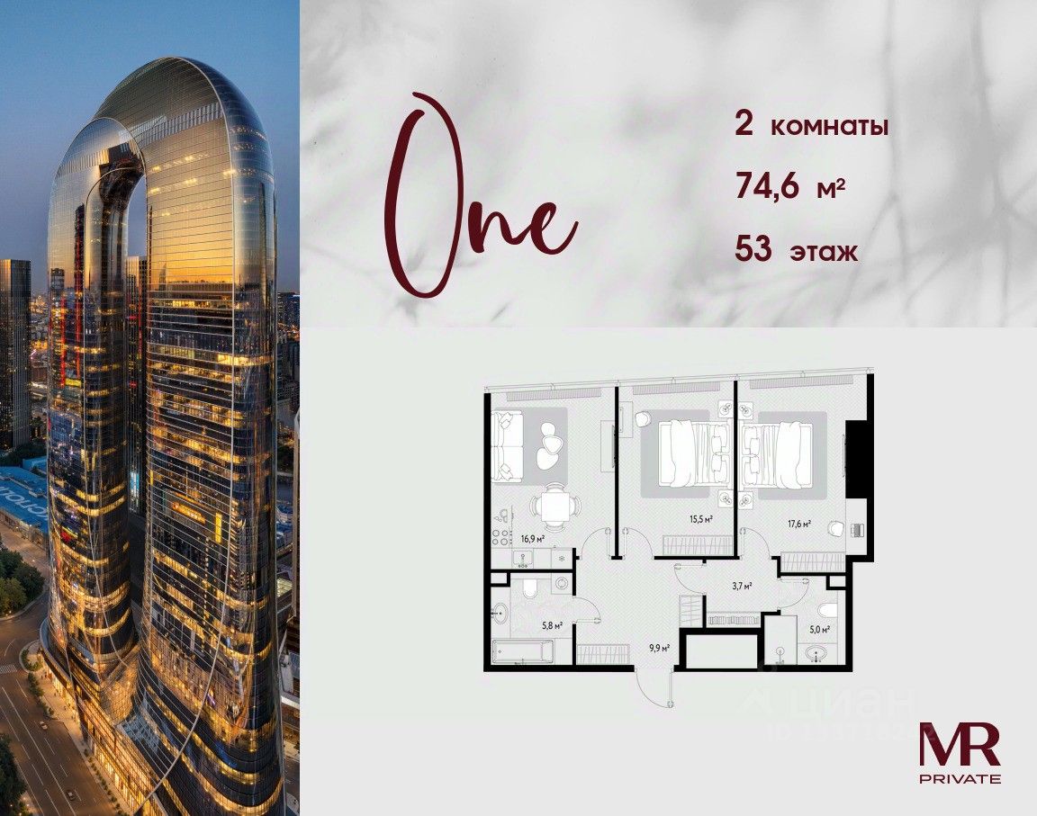В продаже 2-комнатная квартира площадью 74.60 м² на 53-м этаже.