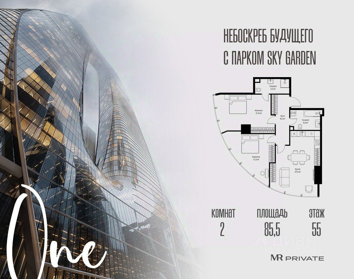 В продаже 2-комнатная квартира площадью 85.50 м² на 55-м этаже.