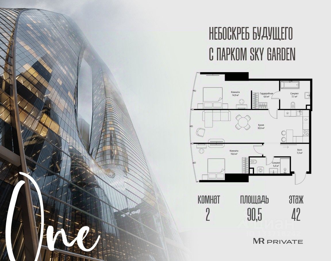 В продаже 2-комнатная квартира площадью 90.50 м² на 42-м этаже.