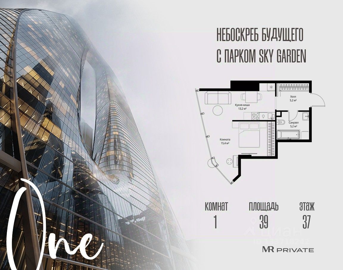 В продаже 1-комнатная квартира площадью 39.00 м² на 37-м этаже.