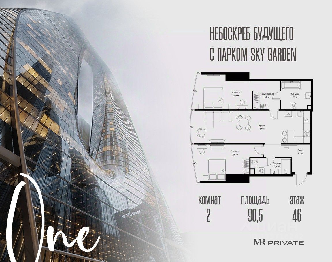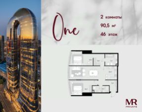 В продаже 2-комнатная квартира площадью 90.50 м² на 46-м этаже.