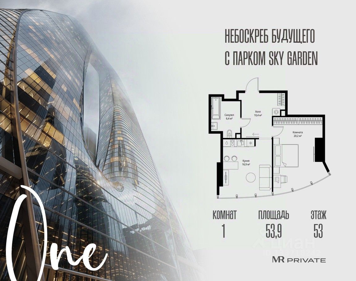 В продаже 1-комнатная квартира площадью 53.90 м² на 53-м этаже.