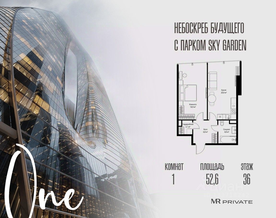 В продаже 1-комнатная квартира площадью 52.60 м² на 36-м этаже.