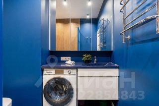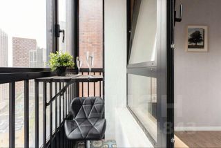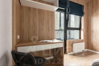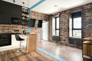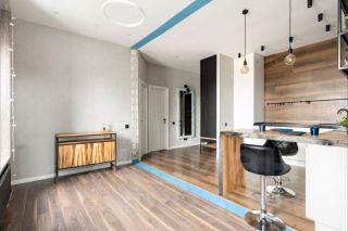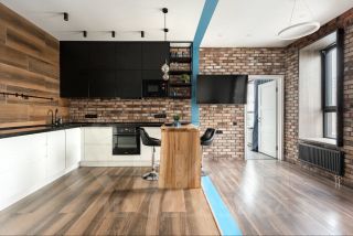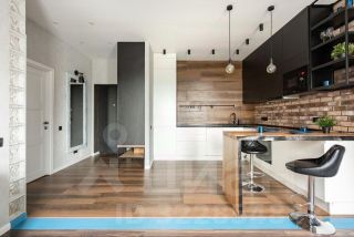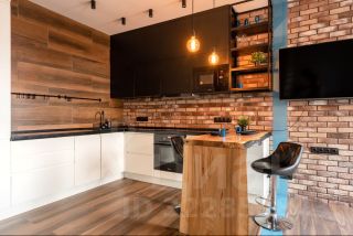 В квартире отделка в стиле лофт. На кухне столешница из искусственного камня. Барная стойка и тумба из слэба. Есть посудомоечная машина, варочная панель, духовой шкаф, встроенный холодильник