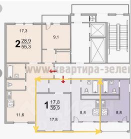 Общая площадь квартиры составляет 39 кв.м, жилая площадь — 18 кв.м, площадь кухни — 9 кв.м. Лоджия (застеклена) расположена на кухне. Окна выходят на улицу. Высота потолков — 2.65 метра.