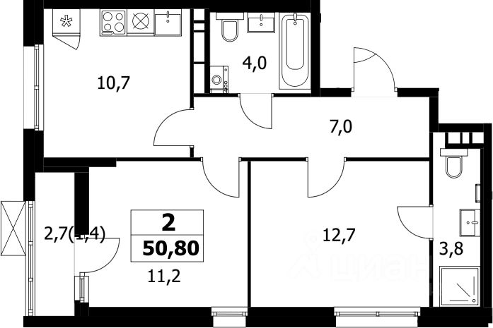 Квартира общей площадью 50,8 м. кв. с двумя спальнями и полноценной кухней, двумя санузлами и лоджией. Квартира без отделки. Передача ключей запланирована на 1 квартал 2027 года.