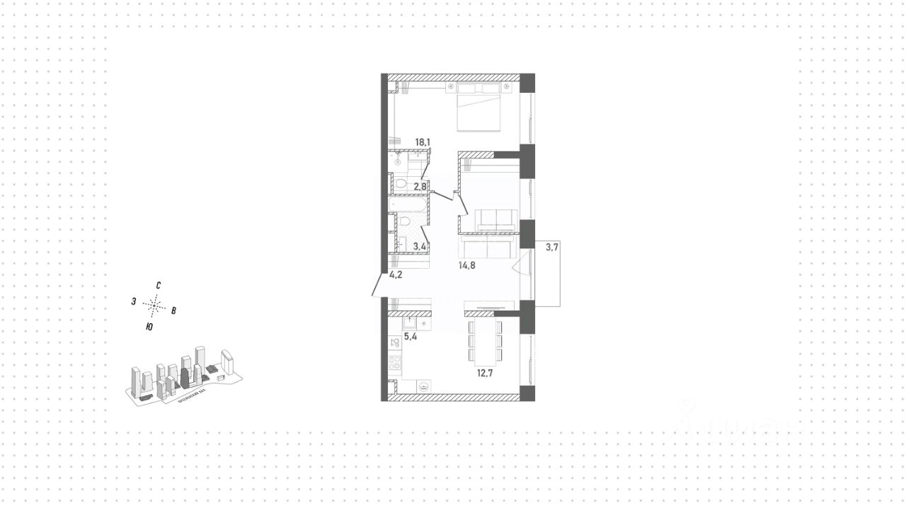 Просторная квартира с двумя спальнями общей площадью 73 м² в комплексе премиум-класса Republic предлагается к продаже с отделкой Whitebox