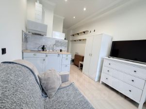 В помещении выполнен современный ремонт, есть вся необходимая мебель и техника: кухонный блок, холодильник Bosch, стиральная машина LG, вытяжка Bosch, кран Grohe, шкаф для хранения, диван. Можно заселяться сразу или сдавать без дополнительных вложений.