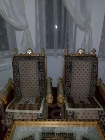 3. 1я комната - есть все для работы, отдыха и приема гостей: большая кровать из массива дерева, письменный стол и табуретка, три шкафа, два кресла и журнальный столик с зеркальной поверхностью, зеркало в полный рост и напольная вешалка для одежды.