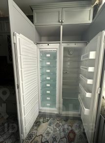 Встроенная кухня из массива дуба, оборудованная всей необходимой встроенной техникой: холодильник Side-by-Side Liebherr, свч, варочная панель, посудомоечная машина, духовой шкаф, вытяжка
