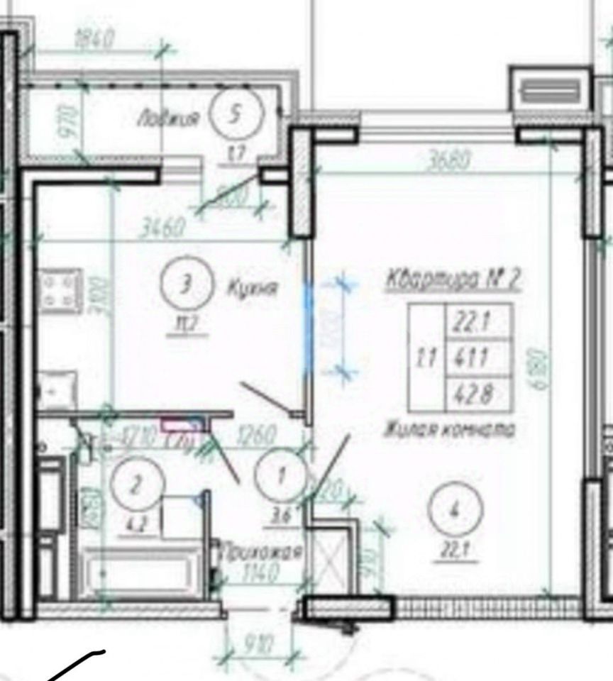 Площадь: 43,1 м², балкон, жилая площадь 22,2 квм
