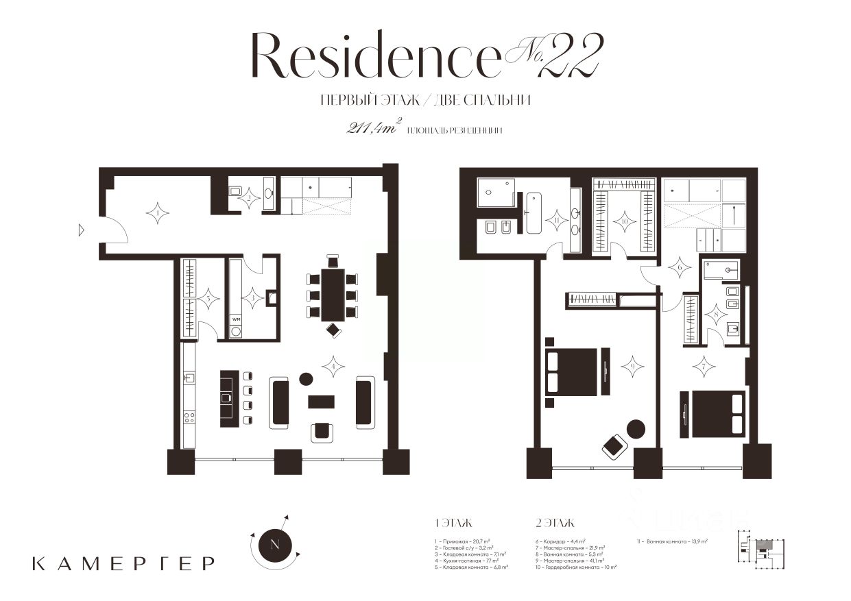 2-этажная резиденция класса deluxe в новом комплексе особняков "Камергер" в 300 метрах от Кремля. В резиденции продуманное планировочное решение. Первый этаж это просторная кухня-гостиная и хозяйственные помещения. На втором этаже располагаются две просторные мастер-спальни с панорамным видом на закрытую территорию комплекса. Отделка осуществляется с применением натуральных материалов: мрамора и ценных пород дерева. Подобраны элегантные детали интерьера и мягкая мебель. Высокие потолки 3,5 метра.