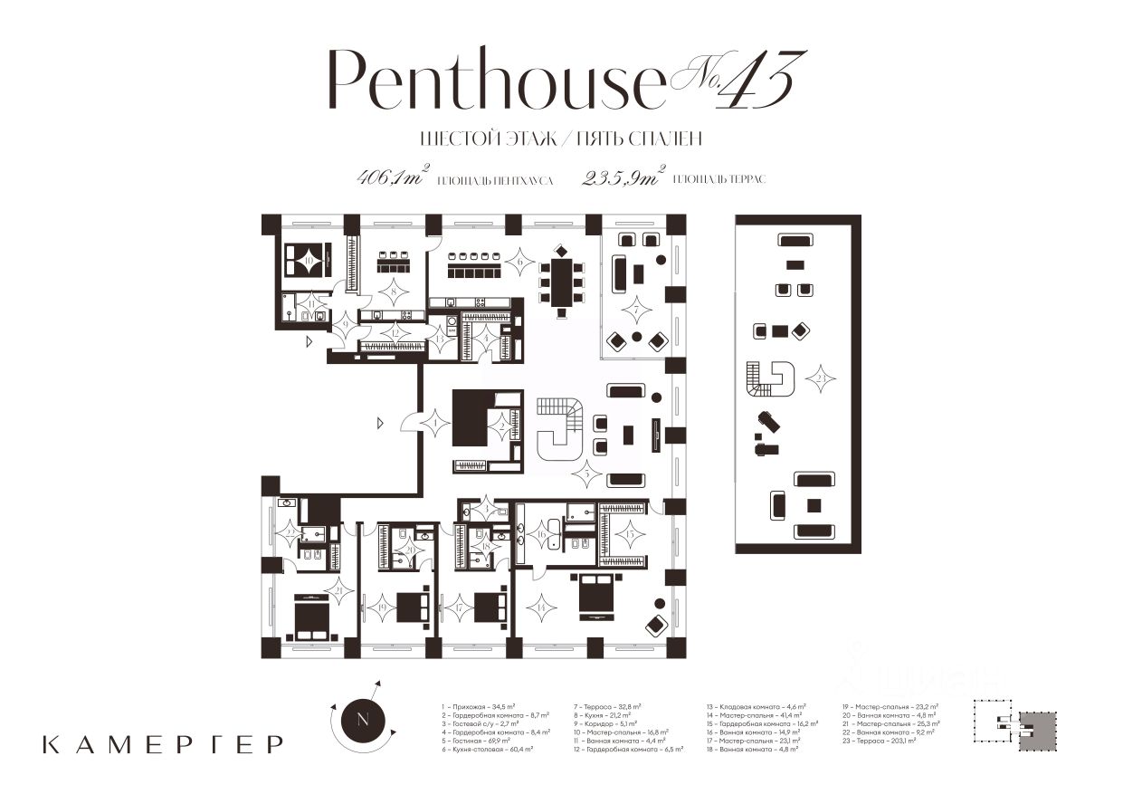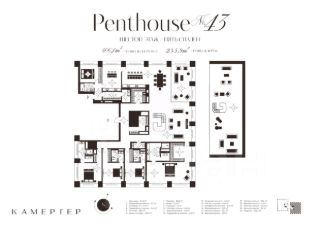 Пентхаус класса deluxe в новом комплексе особняков "Камергер" в 300 метрах от Кремля. В пентхаусе продуманное планировочное решение: просторная хозяйская мастер-спальня со своей гардеробной и ванной комнатой, 4 спальни со своими ванными комнатами, зона для приема гостей с просторной гостиной, кухней-столовой, изолированная кухня, терраса площадью 33 кв. м на уровне апартамента и хозяйственные помещения. Особая привилегия пентхауса самые высокие панорамные окна с видом на 4 стороны света и собственная терраса площадью 203 кв. м на кровле особняка. Отделка осуществляется с применением натуральных материалов: мрамора и ценных пород дерева. Подобраны элегантные детали интерьера и мягкая мебель. Высокие потолки 4,1 метра.