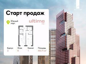 Старт продаж! Продаётся 1-комнатная квартира от застройщика ГК "КОРТРОС" в жилом комплексе бизнес-класса ULTIMAcity. Квартира расположена на 6 этаже 52 этажного корпуса 2. Общая площадь 49,71 м². Без отделки.