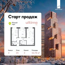 Старт продаж! Продаётся 2-комнатная квартира от застройщика ГК "КОРТРОС" в жилом комплексе бизнес-класса ULTIMAcity. Квартира расположена на 25 этаже 52 этажного корпуса 2. Общая площадь 52,76 м². Без отделки.