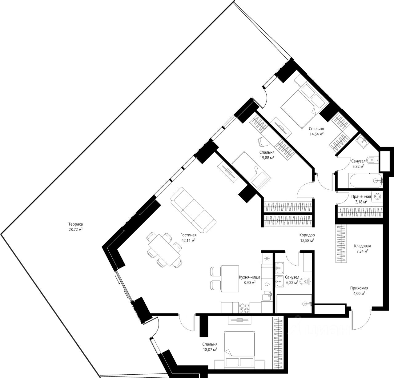 В продаже квартира площадью 166.96 м² без отделки на 12 этаже 55 этажного дома. Квартира расположена в корпусе Anna.