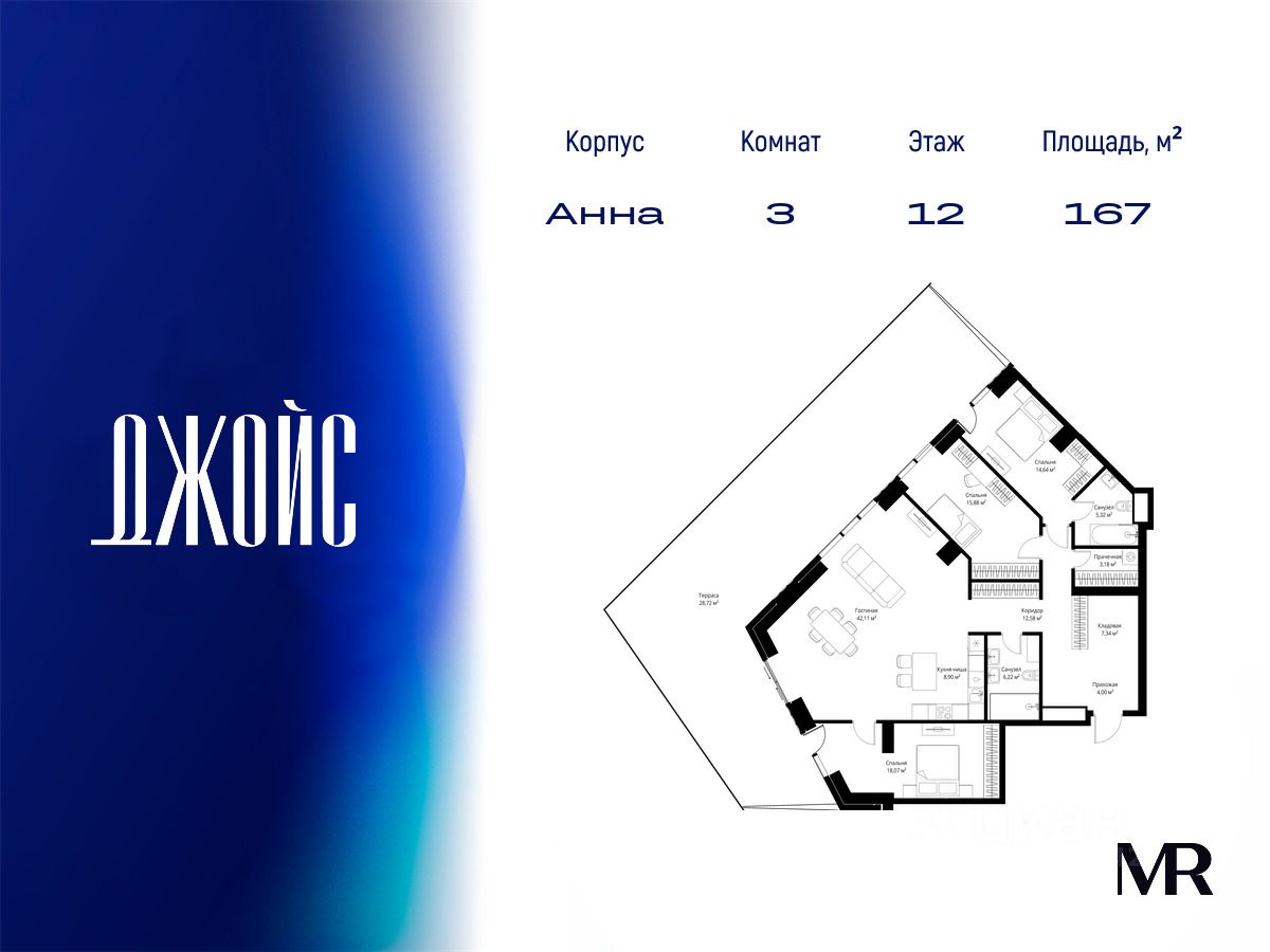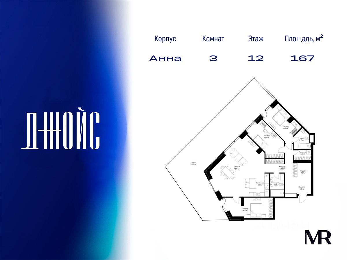 В продаже квартира площадью 166.96 м² без отделки на 12 этаже 55 этажного дома. Квартира расположена в корпусе Анна.