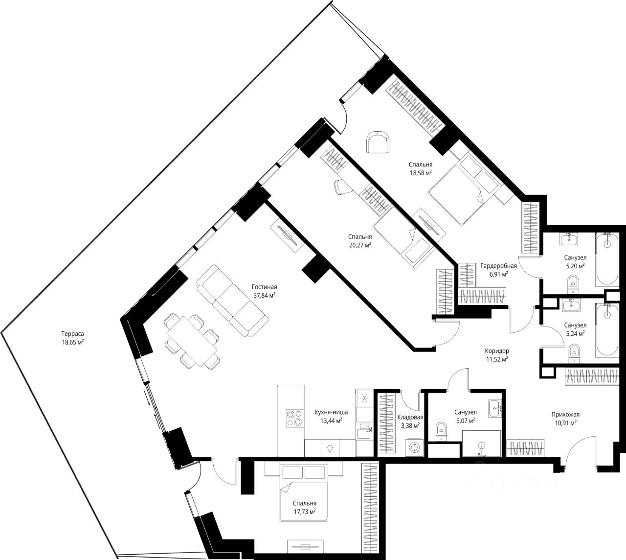 В продаже квартира площадью 174.74 м² без отделки на 13 этаже 55 этажного дома. Квартира расположена в корпусе Anna.