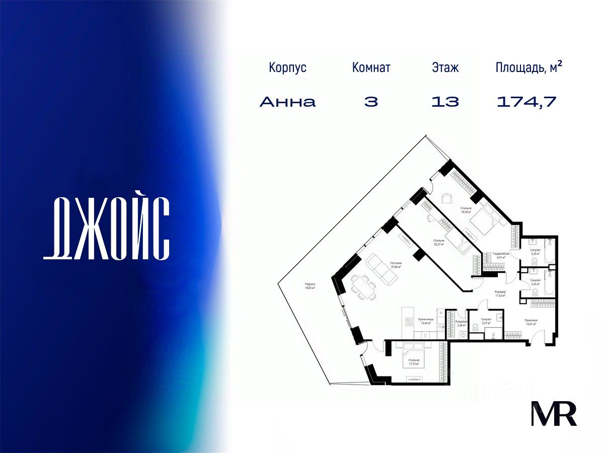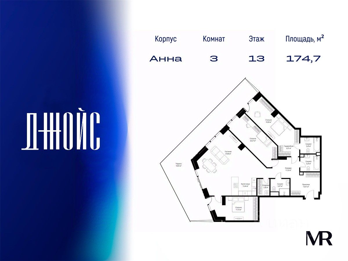 В продаже квартира площадью 174.74 м² без отделки на 13 этаже 55 этажного дома. Квартира расположена в корпусе Анна.