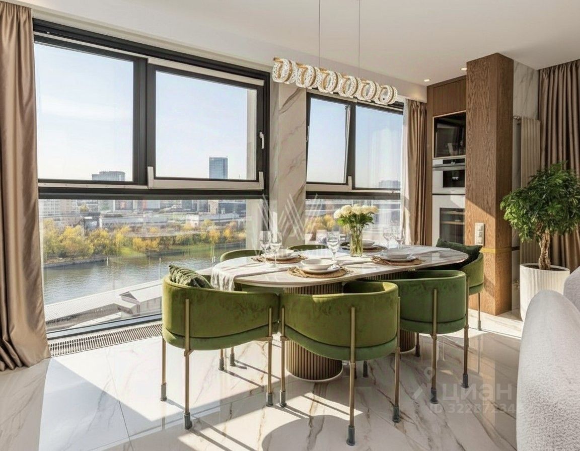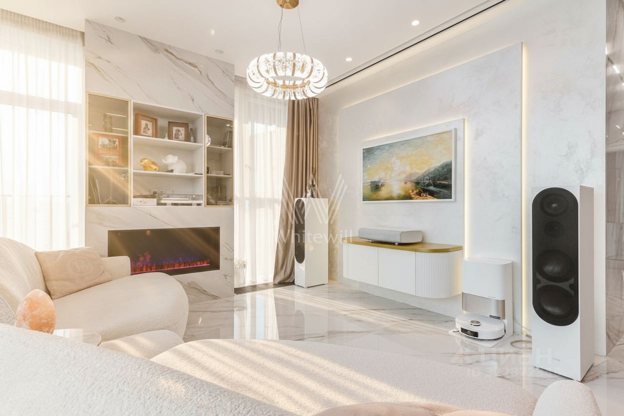Квартира полностью меблирована и укомплектована бытовой техникой. Функциональная планировка включает гостиную с камином и домашним кинотеатром, кухню, мастер-спальню с собственной ванной комнатой, гардеробной и выходом на балкон, две спальни, санузел с душевой кабиной и холл. Благодаря панорамному остеклению пространство наполнено естественным светом и теплом, открываются виды на город и Москву-реку.