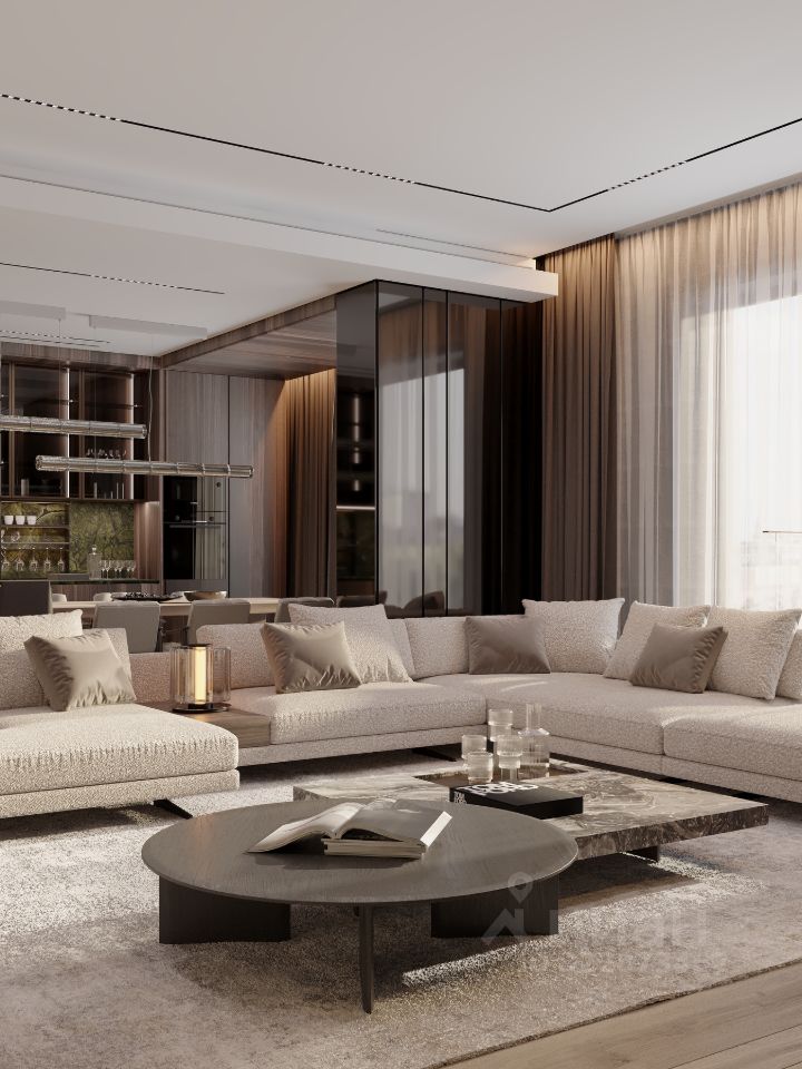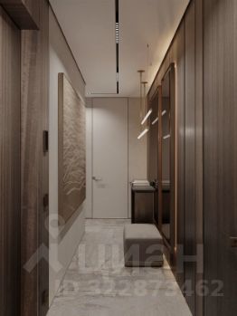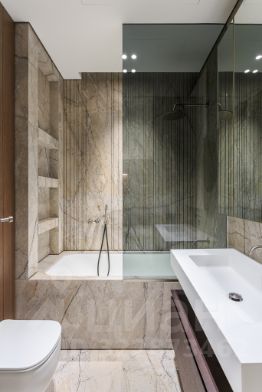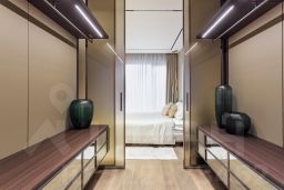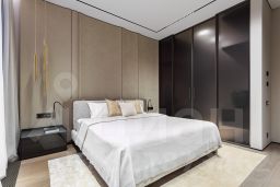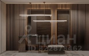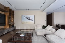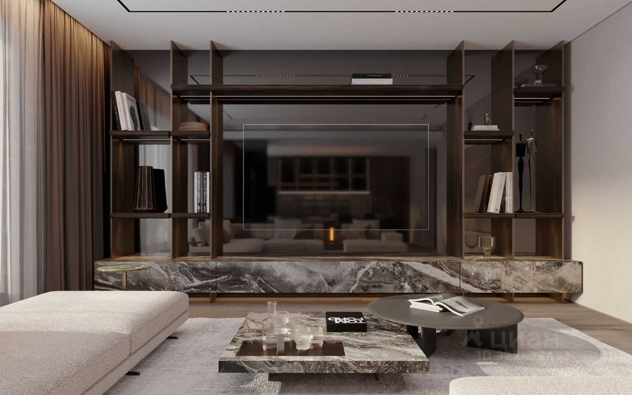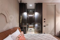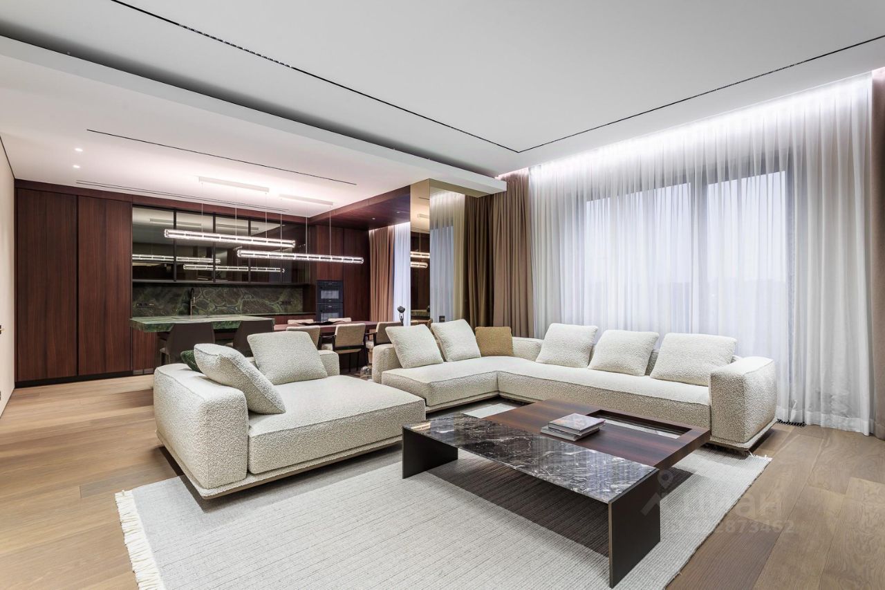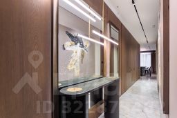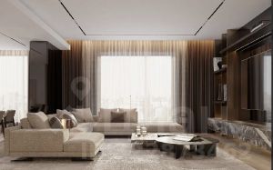 В квартире выполнена премиальная дизайнерская отделка с использованием высококачественных и натуральных материалов, таких как: натуральный мрамор, анодированная бронза, натуральный итальянский шпон, анодированная латунь.