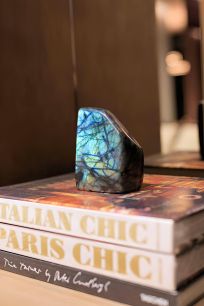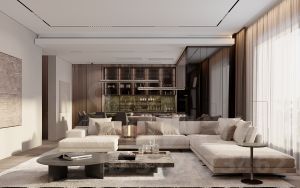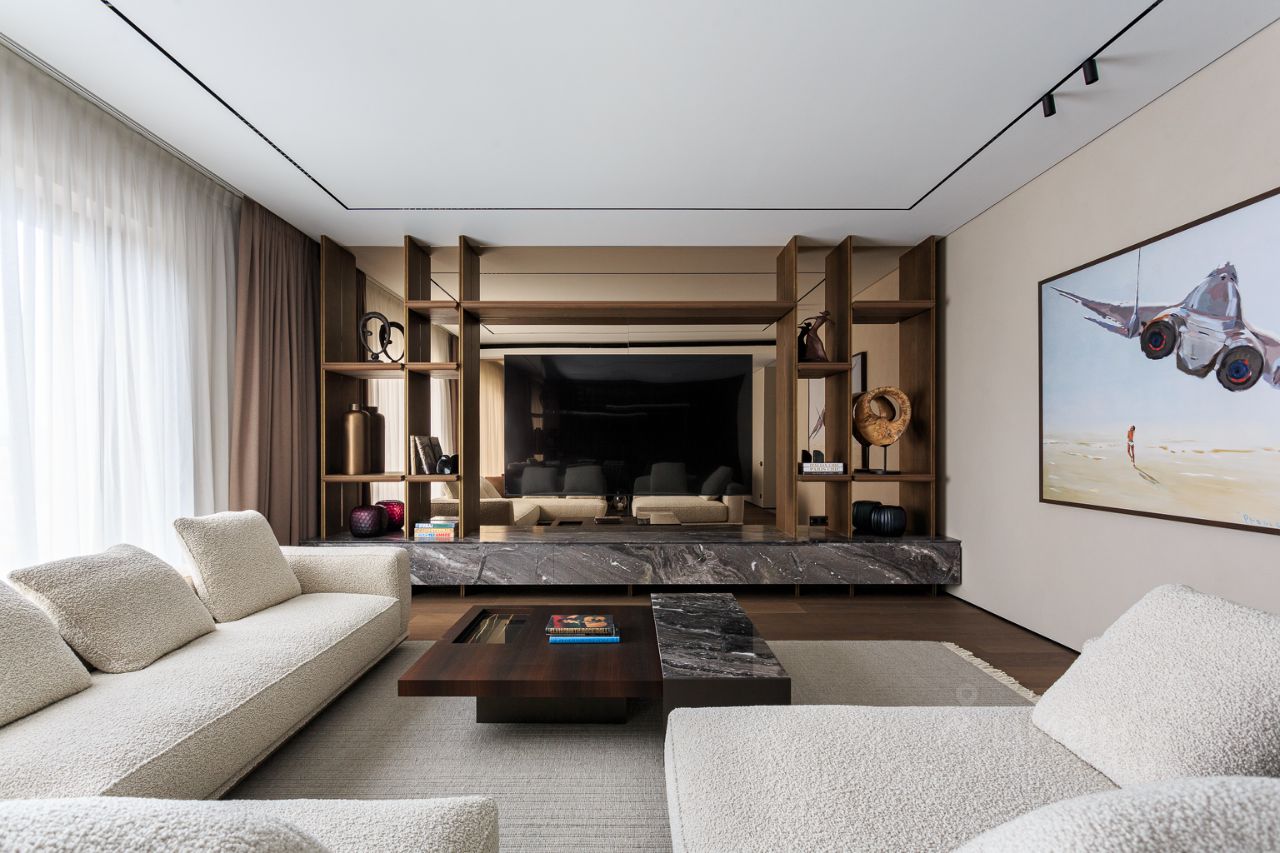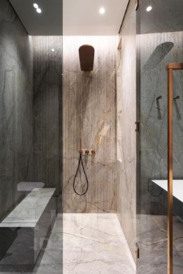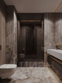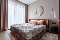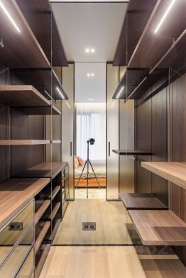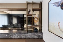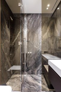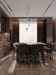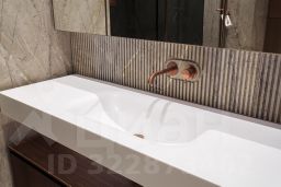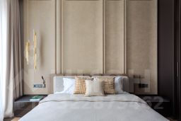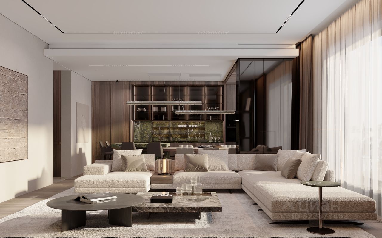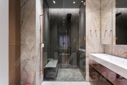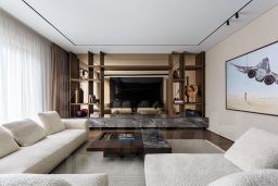 В квартире выполнена премиальная дизайнерская отделка с использованием высококачественных и натуральных материалов, таких как: натуральный мрамор, анодированная бронза, натуральный итальянский шпон, анодированная латунь.