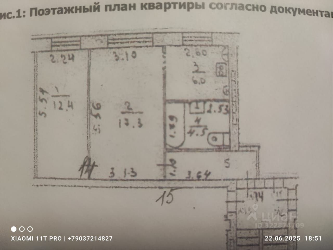 Площадь комнат: спальня 12.4 кв.м, зал 17.3 кв.м, кухня 6 кв.м, совмещенный санузел 4.5 кв.м, прихожая 4 кв.м.