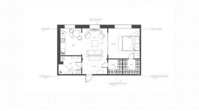 Планировка: гостиная, гардеробная при входе, совмещённый санузел, кухня-столовая, мастер-спальня с гардеробной.